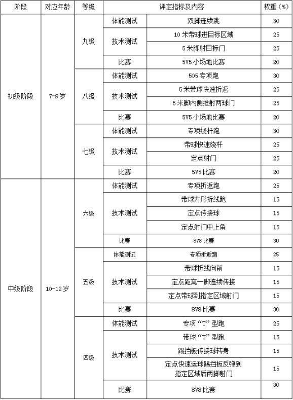 3.1青少年足球技能等级划分为三段九级,对应关系为: