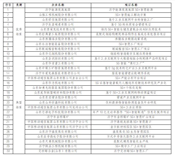 为贯彻落实《山东省5G“百城万站”深度覆盖和“百企千例”规模应用2022年行动方案》(鲁工信工联〔2022〕62号)文件精神,推动企业上云上平台,促进5G技术与工业互联网融合发展,市工信局组织开展了2022年济宁市“5G+工业互联网”典型应用场景申报工作。经企业自愿申报、各县(市、区)工业和信息化主管部门初审推荐、专家评审论证、网上公示等程序,确定济宁能源发展集团“济宁能源发展集团5G+智慧能源”等30个项目为2022年济宁市“5G+工业互联网”典型应用场景,现予公布(见附件)。