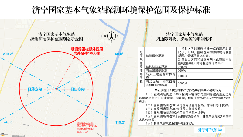 根据《气象设施和气象探测环境保护条例》《气象探测环境保护规范 地面气象观测站》(GB 31221-2014)标准,济宁国家基本气象站气象探测环境保护技术要求如下: