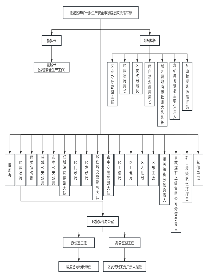 副指挥长:区政府办公室分管副主任、区应急管理局局长、区发改局局长、区自然资源局局长、煤矿属地镇街主要负责人、煤矿属地消防救援大队大队长、矿山救援队伍指挥员。
