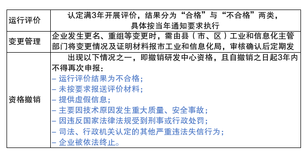 三是明确了市级“一企一技术”研发中心运行评价的期限、指标体系和评价结果,及所在企业发生更名、重组等变更情况的处置及撤销资格情况。