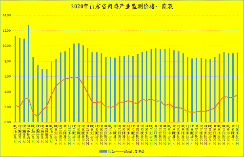 第 50周,我省活鸡价格企稳后向上发力。截至50周末,我省活鸡平均价格为9.14元/公斤,同比降低29.31%,环比升高0.99%,其中最高地区潍坊 安丘价格为15.00元/公斤,最低区域阳信价格为6.40元/公斤。肉雏鸡方面,我省肉雏鸡均价为3.56元/羽,同比降低32.32%,环比回升 8.54%,其中最高价地区青岛即墨价格为5.50元/羽(为正大企业内部价格),最低区域价格聊城莘县为0.65元/羽。