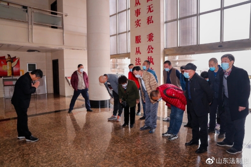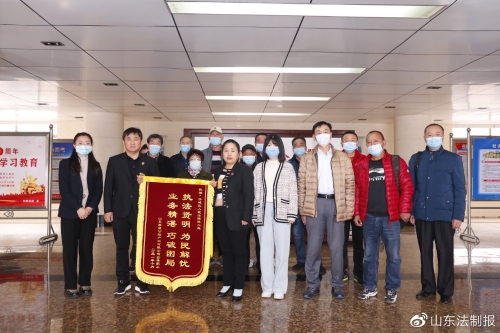11月3日一早,赵涵光一行十几人来到济宁市任城区人民法院,代表山东盛源公路产业有限公司的120多名职工将印有“执法贤明 为民解忧 业务精湛 巧破困局”十六个烫金大字的锦旗交到该院合议庭法官左殿俊、李建兵、李迎春手中,并不约而同的向三位法官及其团队深鞠躬致谢。