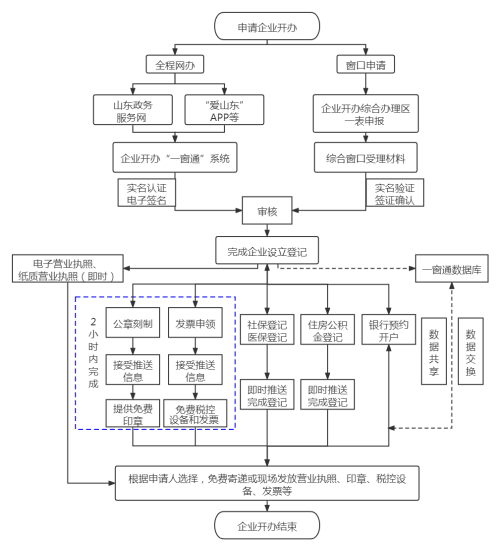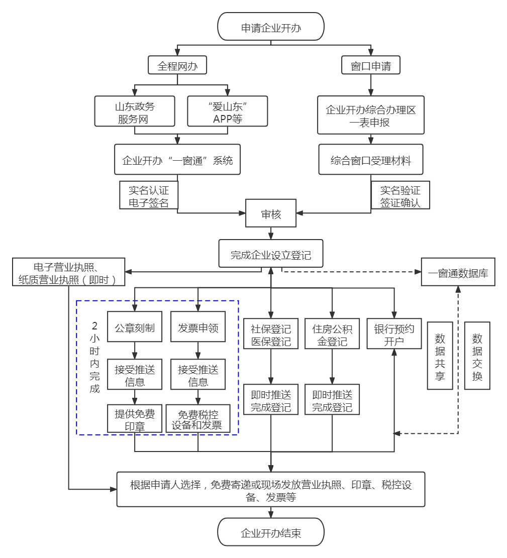 申请人发起企业开办申请,企业登记机关在完成企业设立登记的同时,将企业信息推送至公安部门、税务部门、人社部门、医保部门、住房公积金部门,各审批部门实现新开办企业设立登记、印章刻制和备案、涉税办理、社保登记、医保登记、住房公积金登记相关信息一表填报、一网申请,通过数据推送、信息共享,整合为一个环节办理,并同步启动银行开户在线预约。