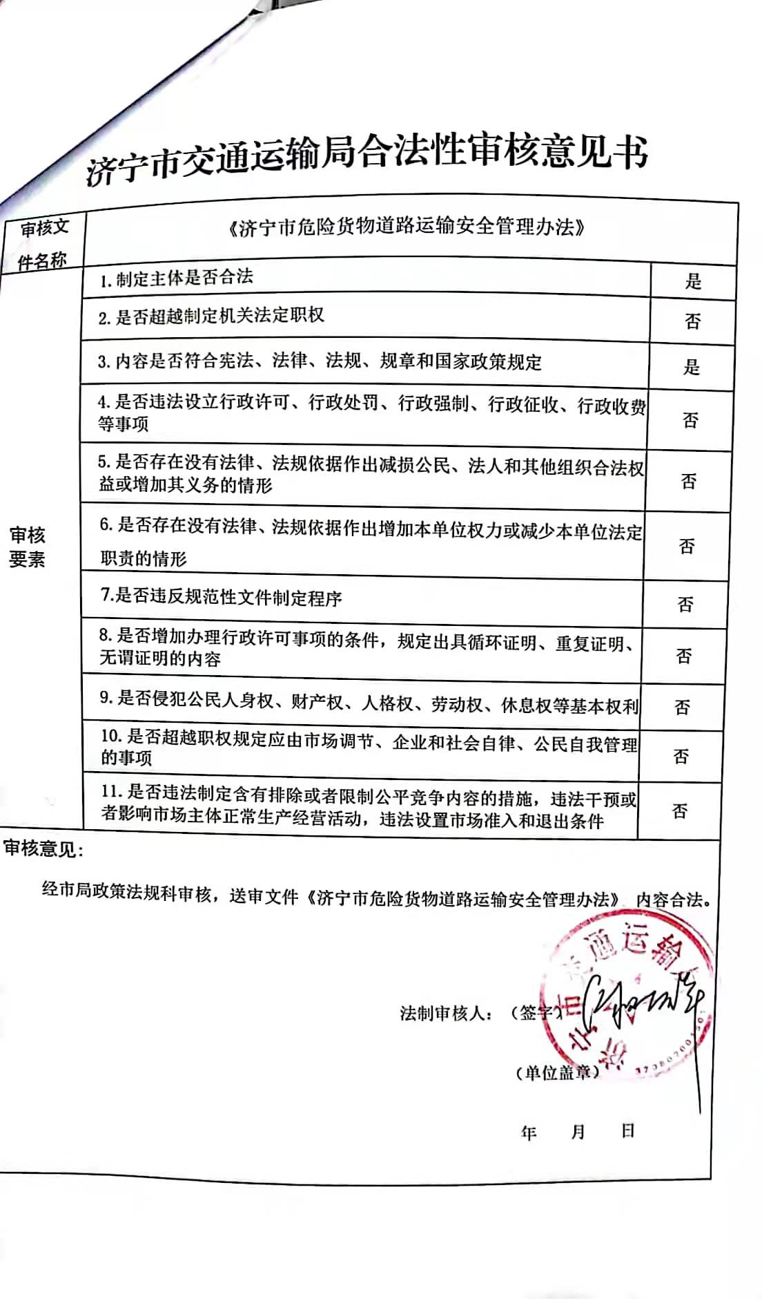 《济宁市危险货物道路运输安全管理办法》合法性审核意见书