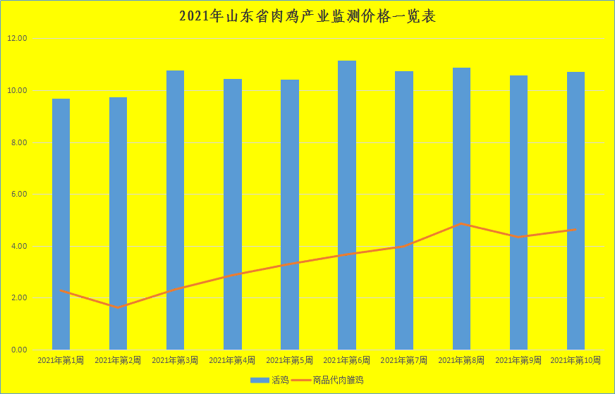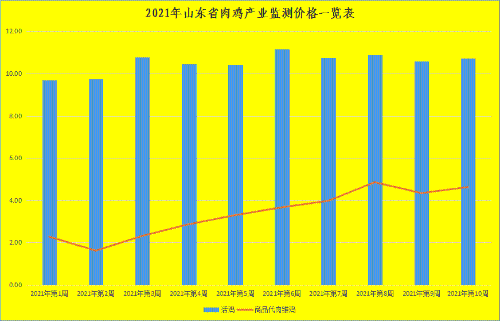 第10周,我省活鸡价格震荡回升。截至第10周末,我省活鸡平均价格为10.71元/公斤,同比升高29.35%,环比回升1.23%,其中最高地区潍坊安丘价格为16.00元/公斤,最低区域阳信价格为9.00元/公斤。在鸡肉消费方面,第10周鸡肉冻品走货畅通,市场交易量环比略增0.14%,白条鸡价格回升至18.49元/公斤,同比减少6.24%,环比升高0.87%。