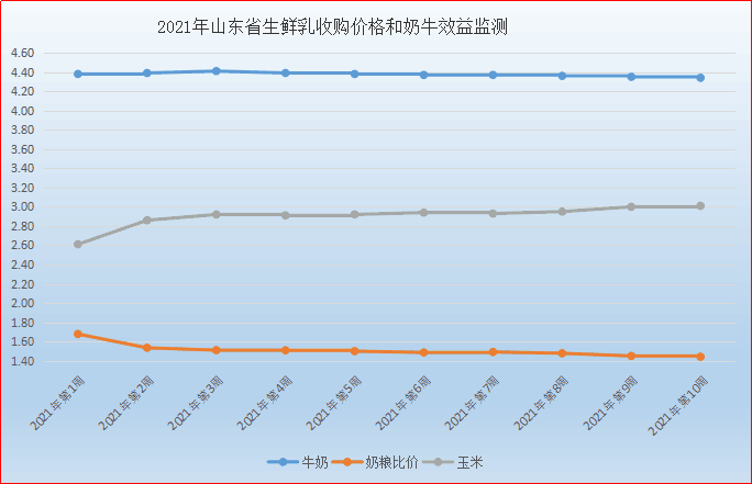 第10周(3月8日-3月14日),我省生鲜乳价格为4.34元/公斤,同比升高13.02%,环比回落0.23%。在我省监测的26个县中,剔除两个无效数据,有7个县的价格高于全省平均价格,其中最高价格在泰安宁阳为4.80元/公斤;最低价格出现在蓬莱和青州,为4.10元/公斤,最高价与最低价差值为0.76元/公斤,差价与上周持平,监测县奶价全部达到4.10元以上,奶业整体发展差异度有所减小。本周奶粮比价为1.44:1,环比减少0.69%。