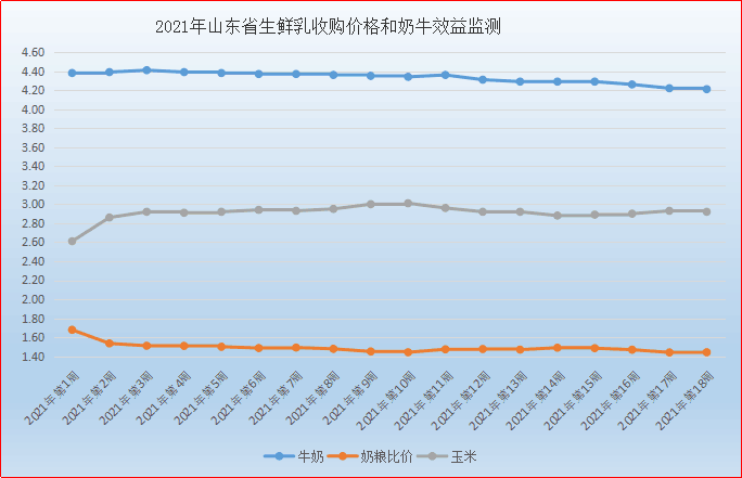 第18周(5月3日-5月9日),我省生鲜乳价格为4.21元/公斤,同比升高17.93%,环比降低0.24%。在我省监测的26个县中,剔除三个无效数据,有11个县的价格高于全省平均价格,其中最高价格在潍坊安丘为4.50元/公斤;最低价格出现在莱芜区,为3.75元/公斤,最高价与最低价差值为0.75元/公斤,差价与上周持平,监测县奶价有3个县低于4元/公斤。本周奶粮比价为1.44:1,环比持平。