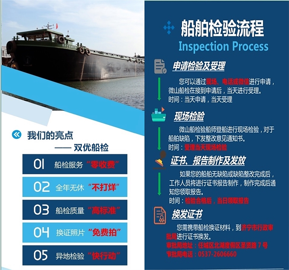 线下,坚持“全年无休日,船检服务不打烊”的服务标准,根据“双优船检”公众号上船员提出的意见建议和反馈的船检需求,全面推行了船检“跟踪服务”,创设了“便民联系卡”,由现场验船师作为检验船舶负责人和联络人,为相关船舶提供船舶缺陷整改、换证照片拍摄上传等服务。