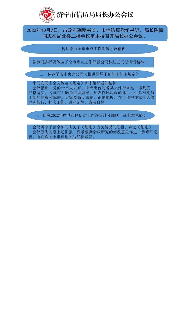 2022年10月7日,市政府副秘书长、市信访局党组书记、局长陈慷同志在局北楼二楼会议室主持召开局长办公会议。