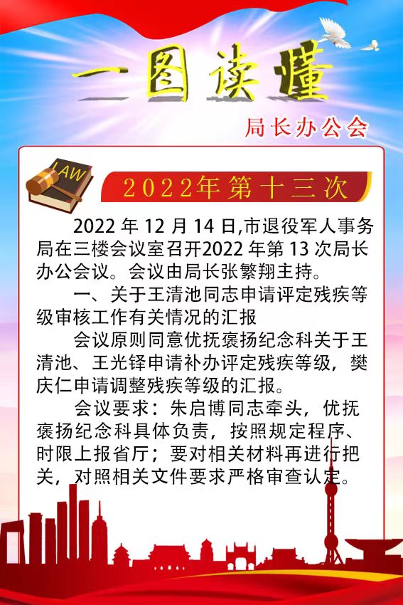 2022 年 12 月14日,市退役军人事务局在三楼会议室召开2022 年第13次局长办公会议。会议由局长张繁翔主持。