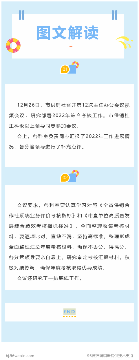 会议要求,各科室要认真学习对照《全省供销合作社系统业务评价考核指标》和《市直单位高质量发展综合绩效考核指标标准》,全面整理收集考核材料,要逐项比对,查缺不漏,坚持高标准,整理形成全面整理汇总年度考核材料,确保不丢分、得高分。各分管领导要亲自靠上,研究审定考核材料,积极对接协调,确保年度考核取得优异成绩。