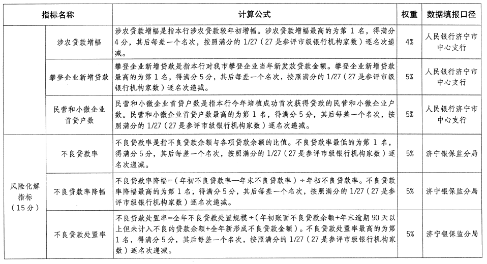 2、结构优化指标:普惠金融重点领域贷款增量、普惠金融重点领域贷款增幅、制造业贷款增量、制造业贷款增幅、涉农贷款增量、涉农贷款增幅、攀登企业新增贷款、民营和小微企业首贷户数等。