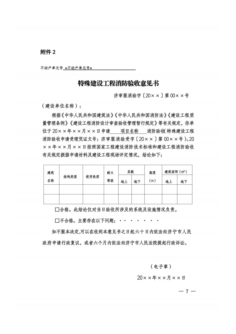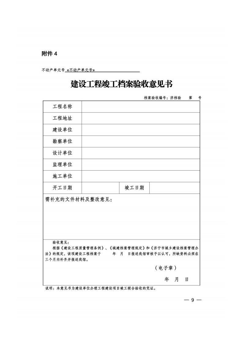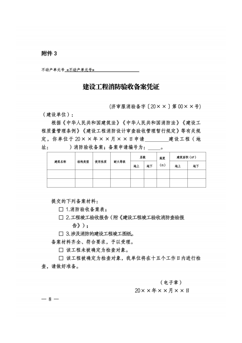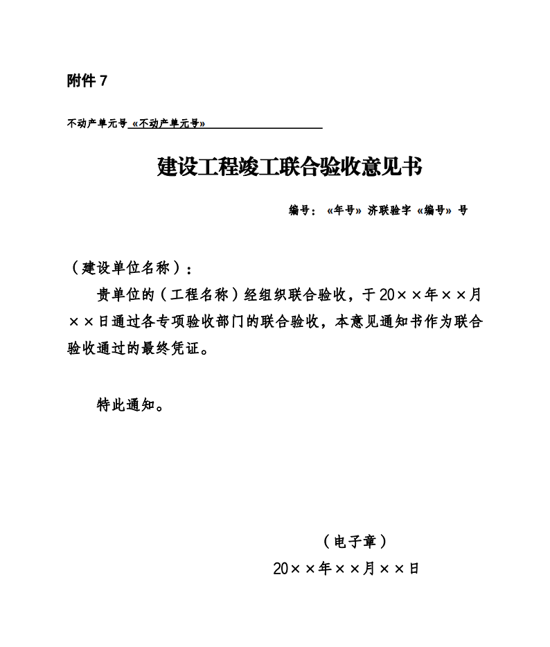 本次启用的《建设工程竣工规划核实合格证》、《特殊建设工程消防验收意见书》、《建设工程消防验收备案凭证》、《建设工程竣工档案验收意见书》、《人防工程竣工验收备案表》、《房屋建筑工程和市政基础设施工程竣工验收备案表》、《建设工程竣工联合验收意见书》严格按照有关电子证照的行业标准和技术规范执行,电子证照由“济宁市工程建设项目审批管理系统”自动生成,注明核发机关名称,加盖“业务审批部门电子证照专用章”后生效,申请人可通过济宁市政务服务网或“爱山东APP”查看下载。