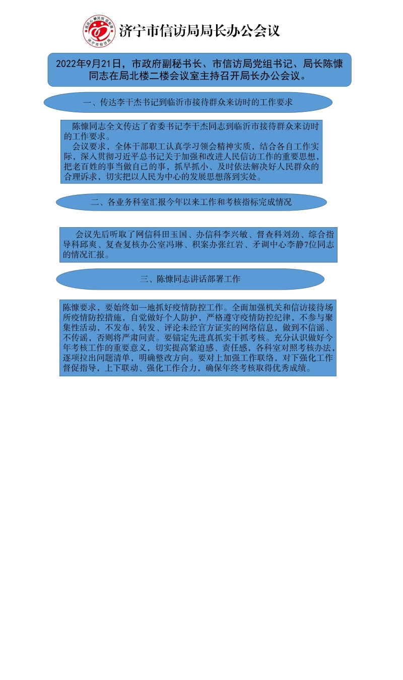 2022年9月21日,市政府副秘书长、市信访局党组书记、局长陈慷同志在局北楼二楼会议室主持召开局长办公会议。