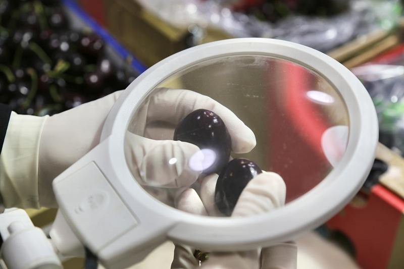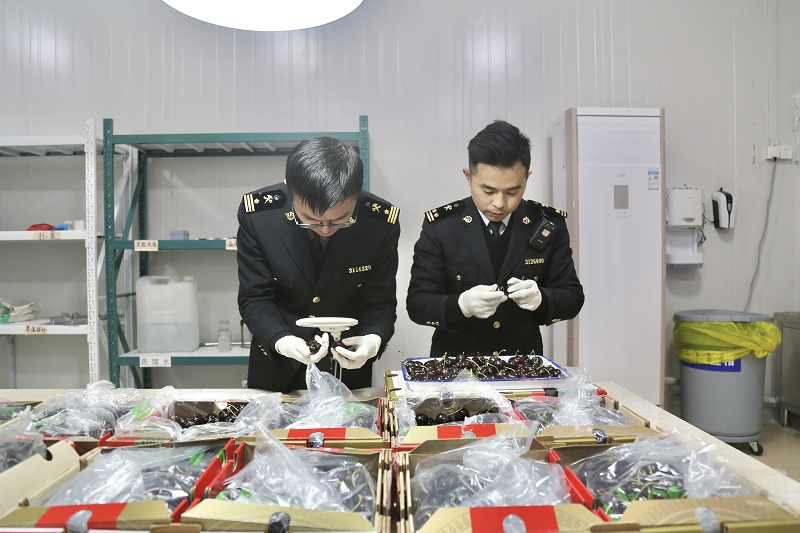 图为:关员对进境车厘子进行查验 胡波波/摄