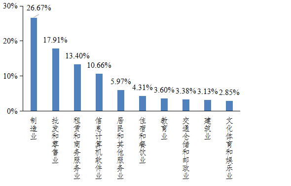 (二)行业需求。本季度前10位行业岗位需求占总需求的91.87%。制造业需求比例环比下降4.18%;批发和零售业、信息计算机软件业需求比例环比上升2.25%、4.59%;房地产业环比下降1.80%(占比2.51%),跌出前十。