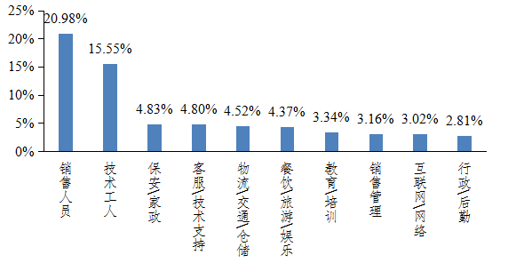 (三)职位需求。市场职位需求前10位中,销售人员、技术工人需求比例稳居前2位,其他职位占比相对较小;与一季度相比,各职位比例变化不大,技术工人环比略有下降。