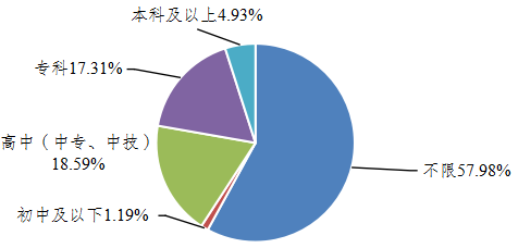 (四)学历需求。市场岗位对学历不做要求的占57.98%,高中(中专、中技)学历及以下占比19.78%;专科及以上学历占22.24%,多数市场岗位对学历不作太高要求。