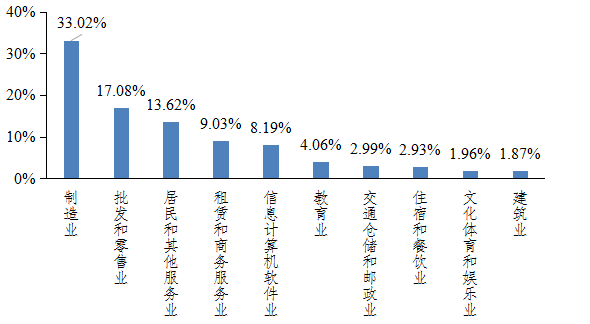 (二)行业需求。一季度前10位行业岗位需求占总需求的94.75%。其中,制造业需求比例保持在30%以上;批发和零售业、教育业需求比例同比下降3.08%、1.11%,居民和其他服务业、信息计算机软件业需求比例同比上升4.55%、2.57%。