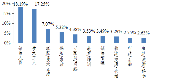 (三)职位需求。市场职位需求前10位中,销售人员、技术工人需求比例保持前2,销售人员、行政/后勤需求比例同比有所下降,技术工人、互联网/网络同比有所上升。