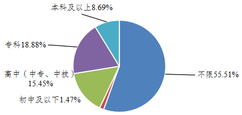 (四)学历需求。市场岗位对学历不做要求的超过半数,占55.51%;专科及以上学历占27.57%,接近3/4的岗位对学历不作过高要求。