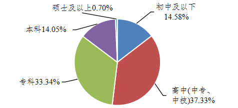 (二)学历结构。各学历求职人员比例变化不大,高中(中专、中技)及以下学历占51.91%,专科学历求职者占33.34%;本科及以上学历占14.75%。