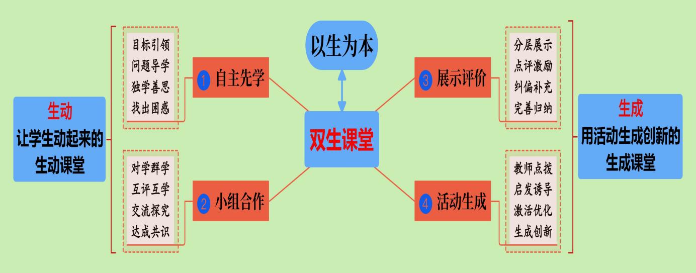 “双生”课堂,即生动、生成的课堂。自主先学、小组合作、展示评价、活动生成,体现既生动又生成的双生教学理念。生动:让学生动起来的生动课堂;生成:用活动生成创新的生成课堂。