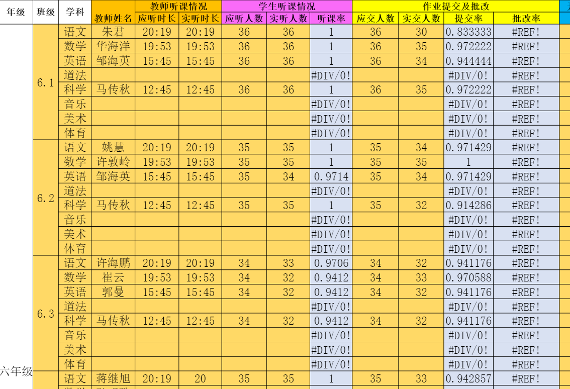 为了促进老师们更加积极地参与线上教学,提高工作效率,学校设计了线上教学常规检查量表。表格涵盖教师听课时间、学生听课与作业完成情况、教师小课堂次数及时长等丰富的内容,让任课教师各项工作的完成情况一目了然。