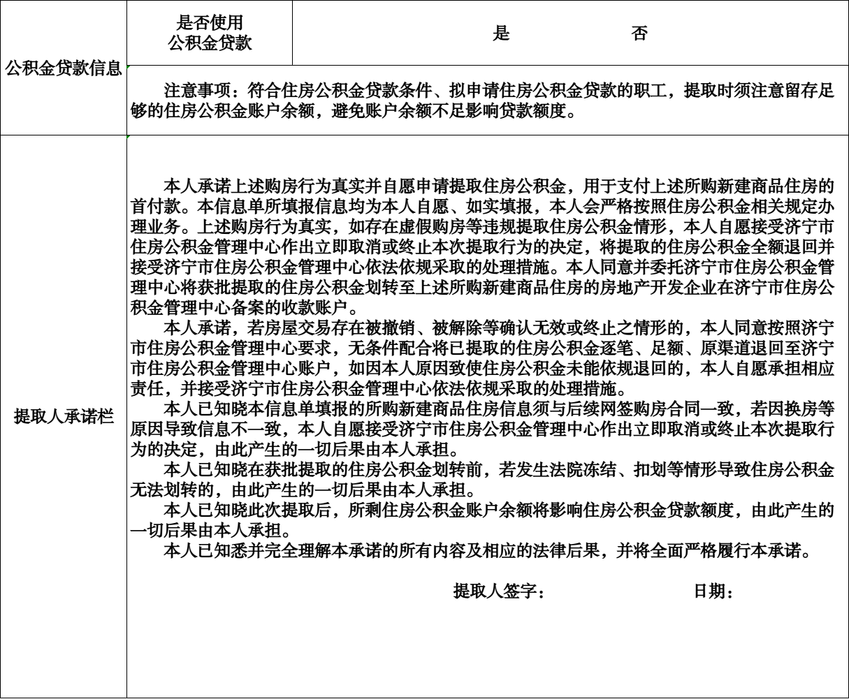职工提取住房公积金支付购房首付款信息单及承诺书