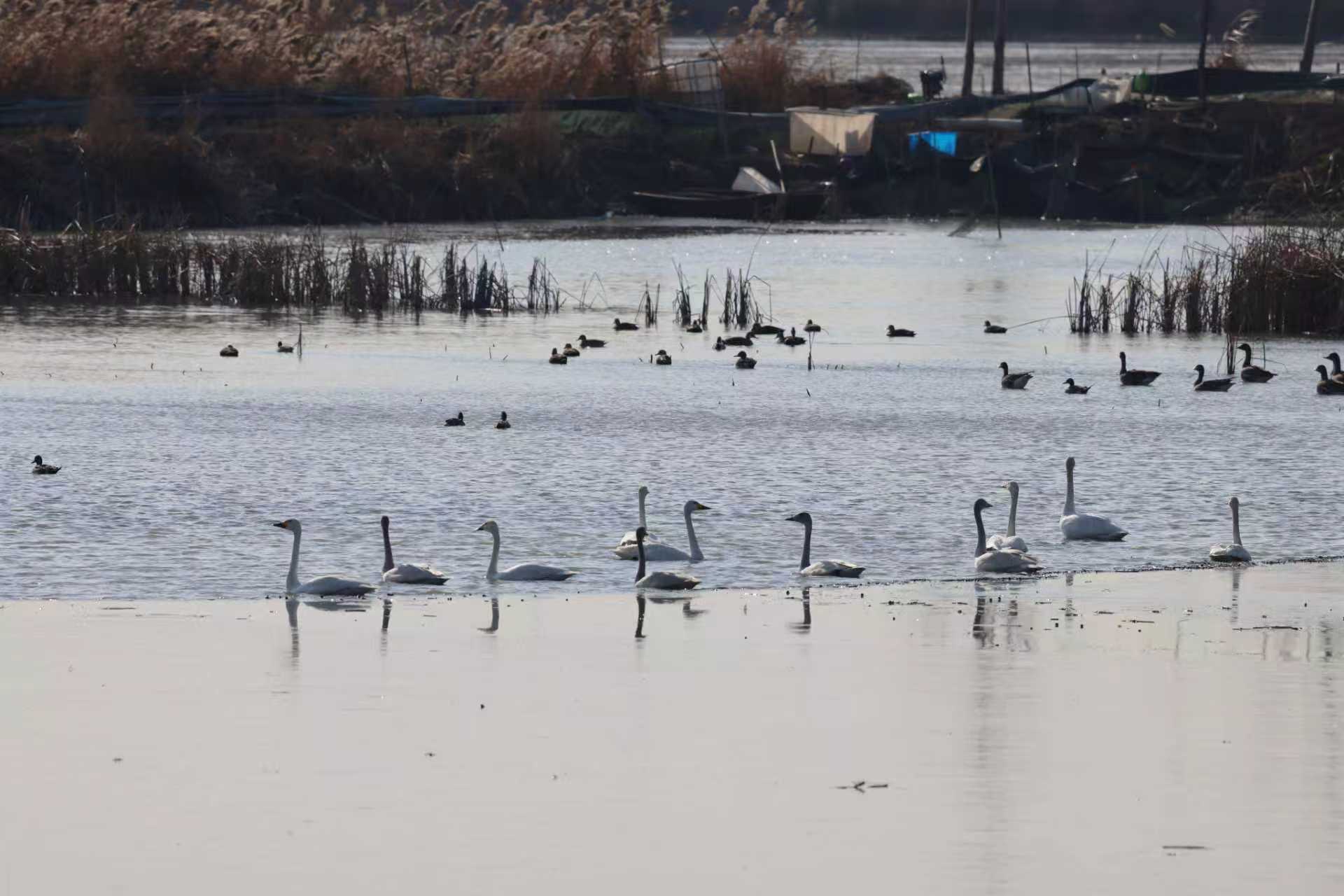 小天鹅是我国国家II级重点保护野生动物,对栖息地水质和食源条件要求极为苛刻。南四湖湖面宽阔、滩草丰茂,是小天鹅越冬迁徙路线上的重要“补给站”,为小天鹅长途迁飞提供了食物供给和夜间庇护所,每年11月至翌年2月都有稳定种群在此停歇、换羽并补充能量。此次生物多样性野外观测活动共观察到小天鹅、大白鹭、白琵鹭、红嘴鸥、斑嘴鸭、豆燕、针尾鸭、绿头鸭、苍鹭、黑水鸡等珍稀水生鸟类,其中小天鹅种群数量高达上百只。小天鹅成群现身南四湖,反映出南四湖自然保护区生态环境持续向好,湿地保护与修复工作取得阶段性成效。