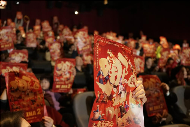 2月8日,人们在美国洛杉矶举行的《哪吒之魔童闹海》北美首映礼上举起电影海报。新华社发(曾慧摄)