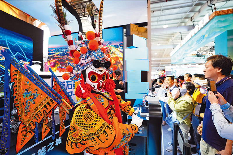 弘扬中华优秀传统文化,要处理好继承和发展的关系,重点做好创造性转化和创新性发展。图为2024年9月15日,在服贸会首钢园区的文旅服务专题展区,孙悟空形象的仿生机器人吸引参观者。 新华社记者 鞠焕宗/摄