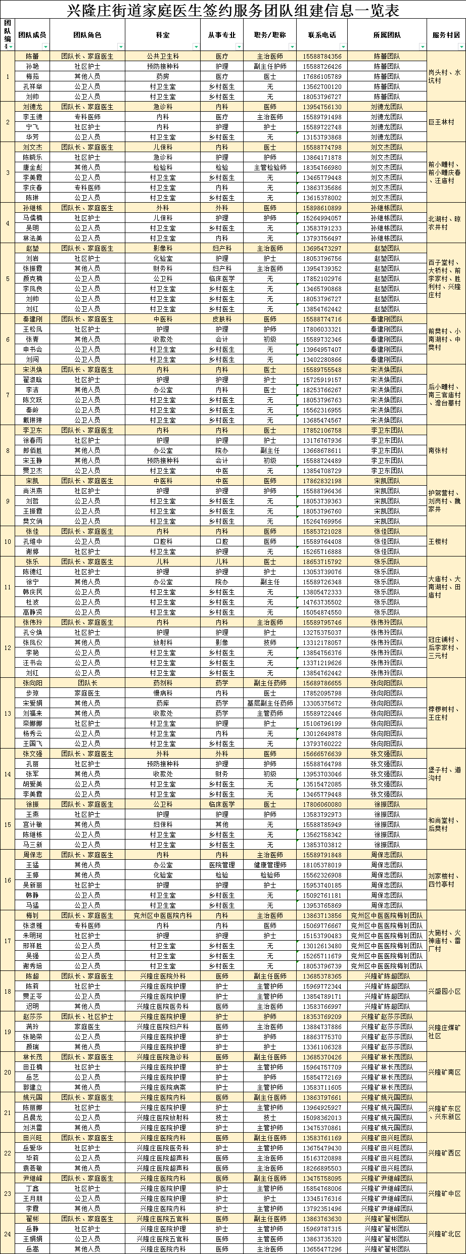 团队编号 | 团队成员 | 团队角色 | 科室 | 从事专业 | 职务/职称 | 联系电话 | 所属团队 | 服务村居 | |