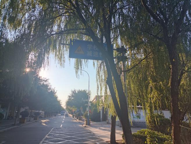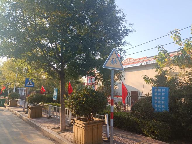学校及周边道路现有交通标志标线及安全警示设施设备,包括:学校标志牌(1个)、限速(2个)、斑马线(2条)、减速带(2个)、让儿童标志牌(2个)防撞拒马4个,防撞石墩子10个。
