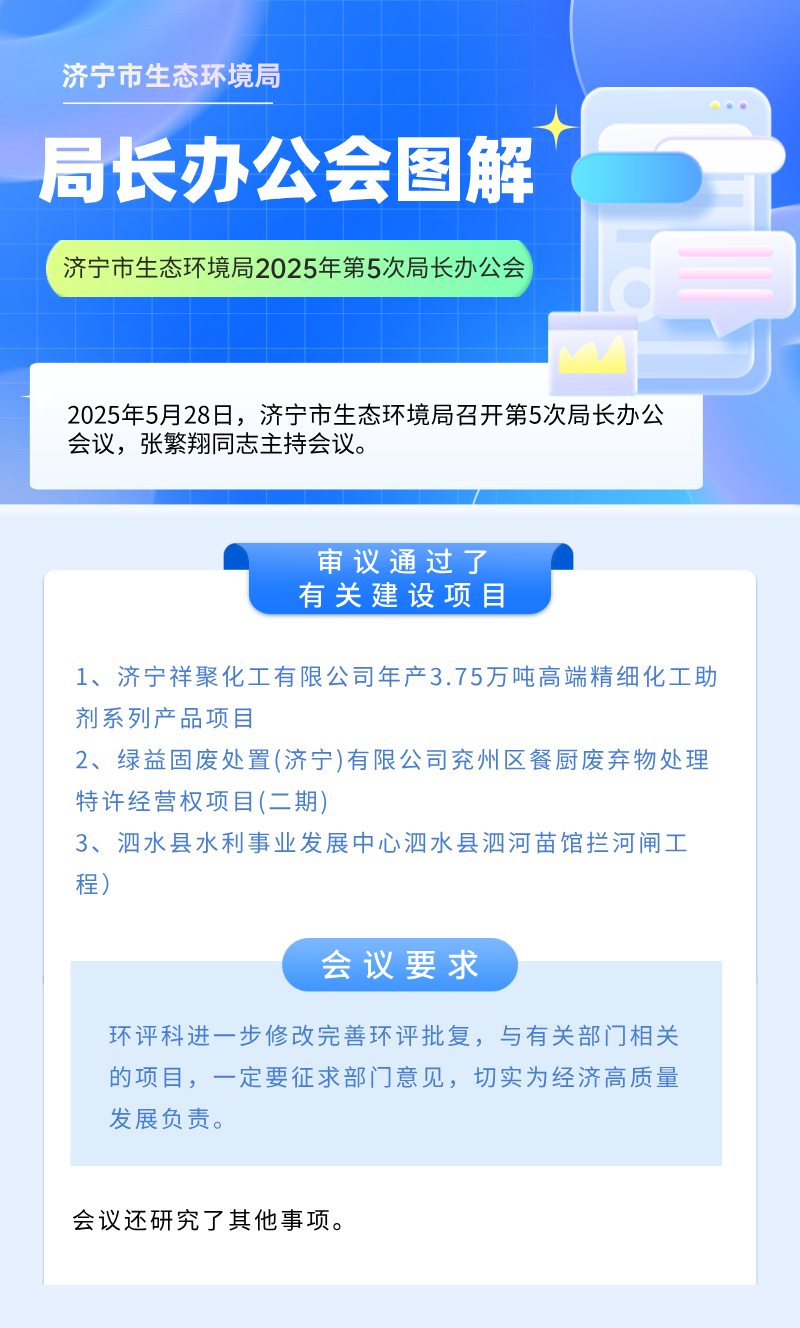 审议通过了有关建设项目(1、济宁祥聚化工有限公司年产3.75万吨高端精细化工助剂系列产品项目,2、绿益固废处置(济宁)有限公司兖州区餐厨废弃物处理特许经营权项目(二期),3、泗水县水利事业发展中心泗水县泗河苗馆拦河闸工程)。