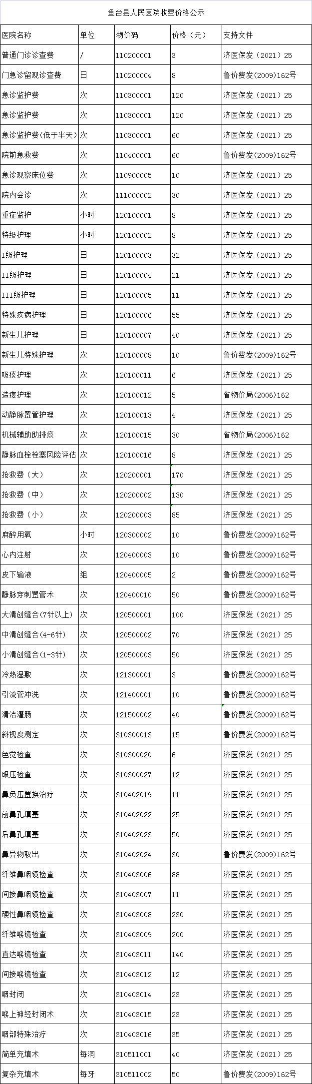 鱼台县人民医院收费价格公示