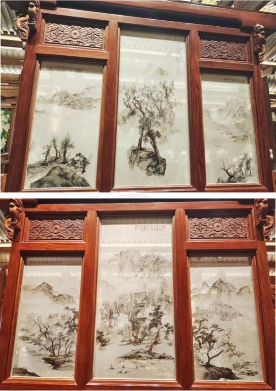 览尼山儒宫,习明礼之风在研学导游的引领下,同学们 从大学堂南侧西入口进入一楼集贤厅,首先映入眼帘的是以 我校燕一群老师的《尼山六景》画作为底稿的苏绣屏风。