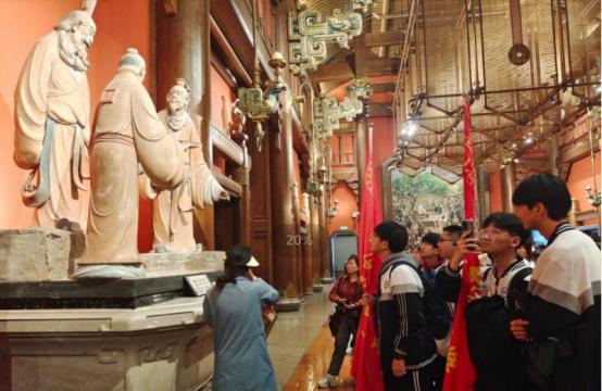 十二贤廊” ,长达90 余米的厅廊 ,用三十组雕塑展现孔子 与七十二名弟子的生动故事。同学们近距离感受着儒家思想 的影响,深受教益。