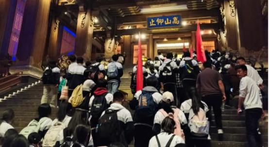 同学们驻足欣赏后前行汇聚于中央顶部的巨型木雕藻 井之下。举首望去,“大学之道”八十一级台阶的尽头是高 悬“高山仰止” 巨幅匾额的仲尼之门。拾阶而上,转入“七
