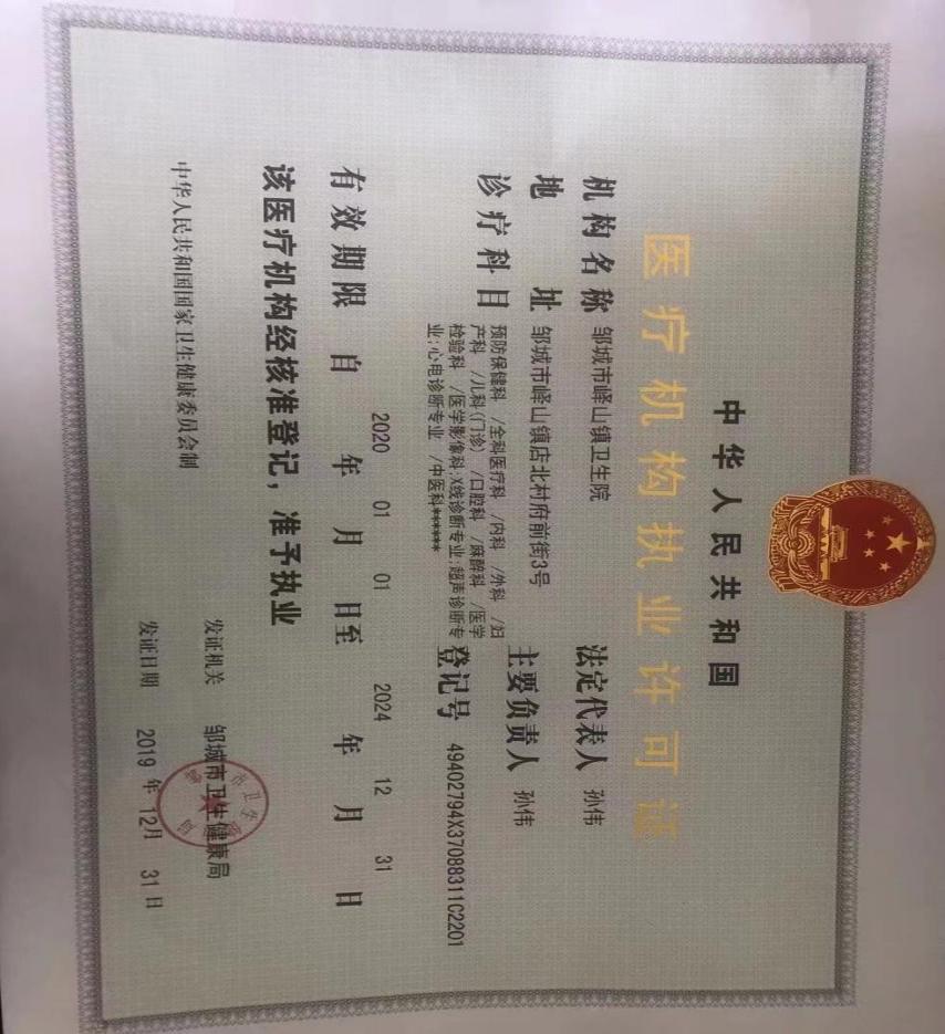 医疗机构备案信息 | 邹城市峄山镇卫生院,法人、主要负责人:孙伟,开设科目:预防保健科/全科医疗科/内科/外科/妇产科:妇科专业/儿科(门诊)/口腔科/麻醉科/医学检验科/医学影像科:X线诊断专业;超声诊断专业;心电诊断专业/中医科******设置床位60张。 | ||