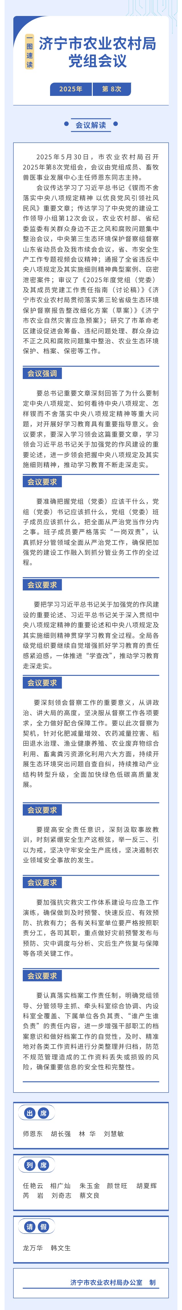 2025年5月30日,市农业农村局召开2025年第8次党组会,会议由党组成员、畜牧兽医事业发展中心主任师恩东同志主持。