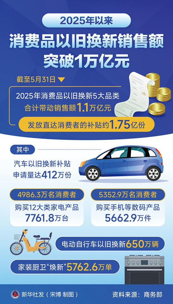 开展新一轮消费品以旧换新,是扩大有效需求、畅通经济循环的重要举措。截至5月31日,2025年消费品以旧换新5大品类合计带动销售额1.1万亿元,发放直达消费者的补贴约1.75亿份。 新华社发 宋博/制图