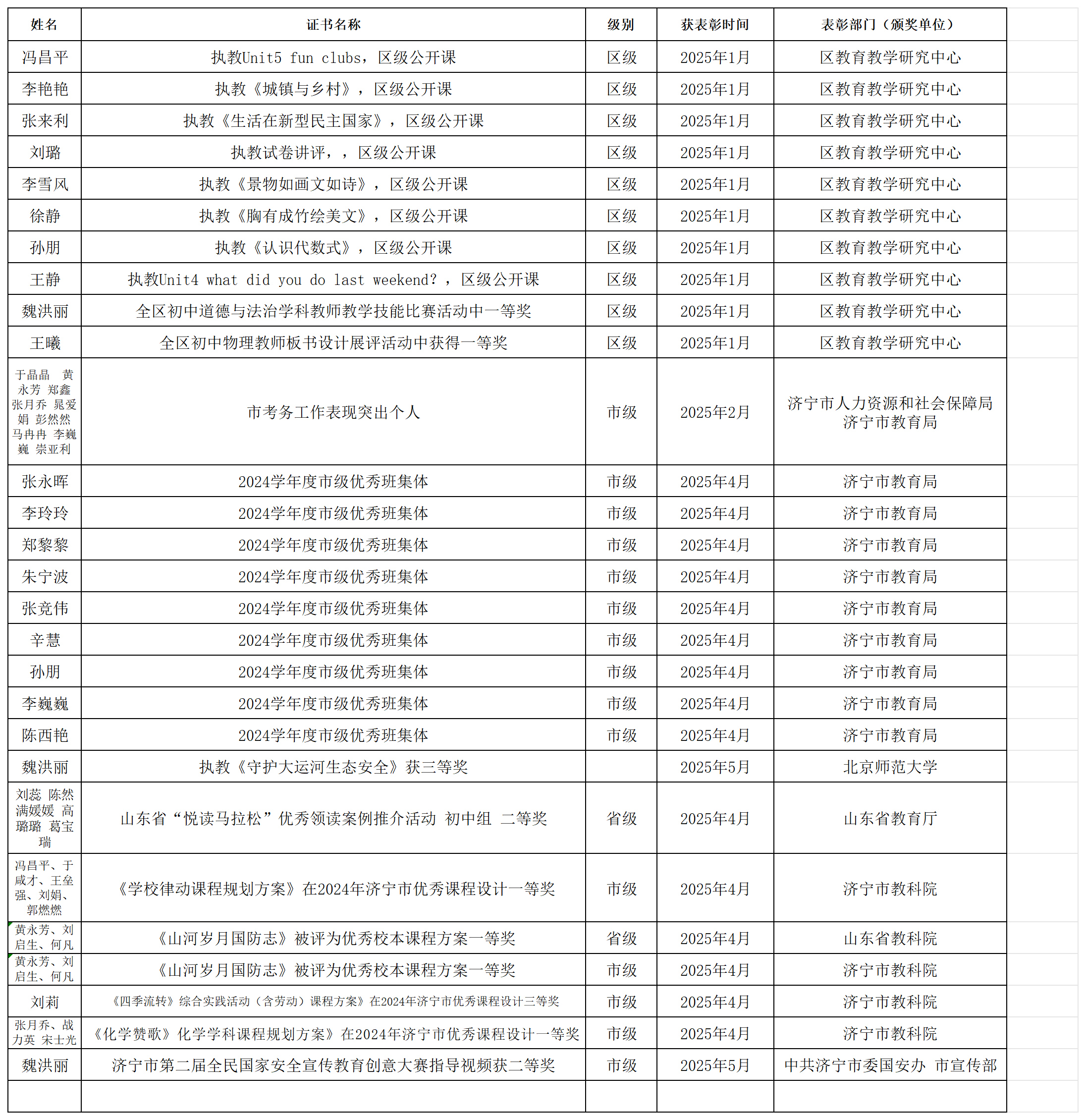济宁市第十三中学2025年教师荣誉公示