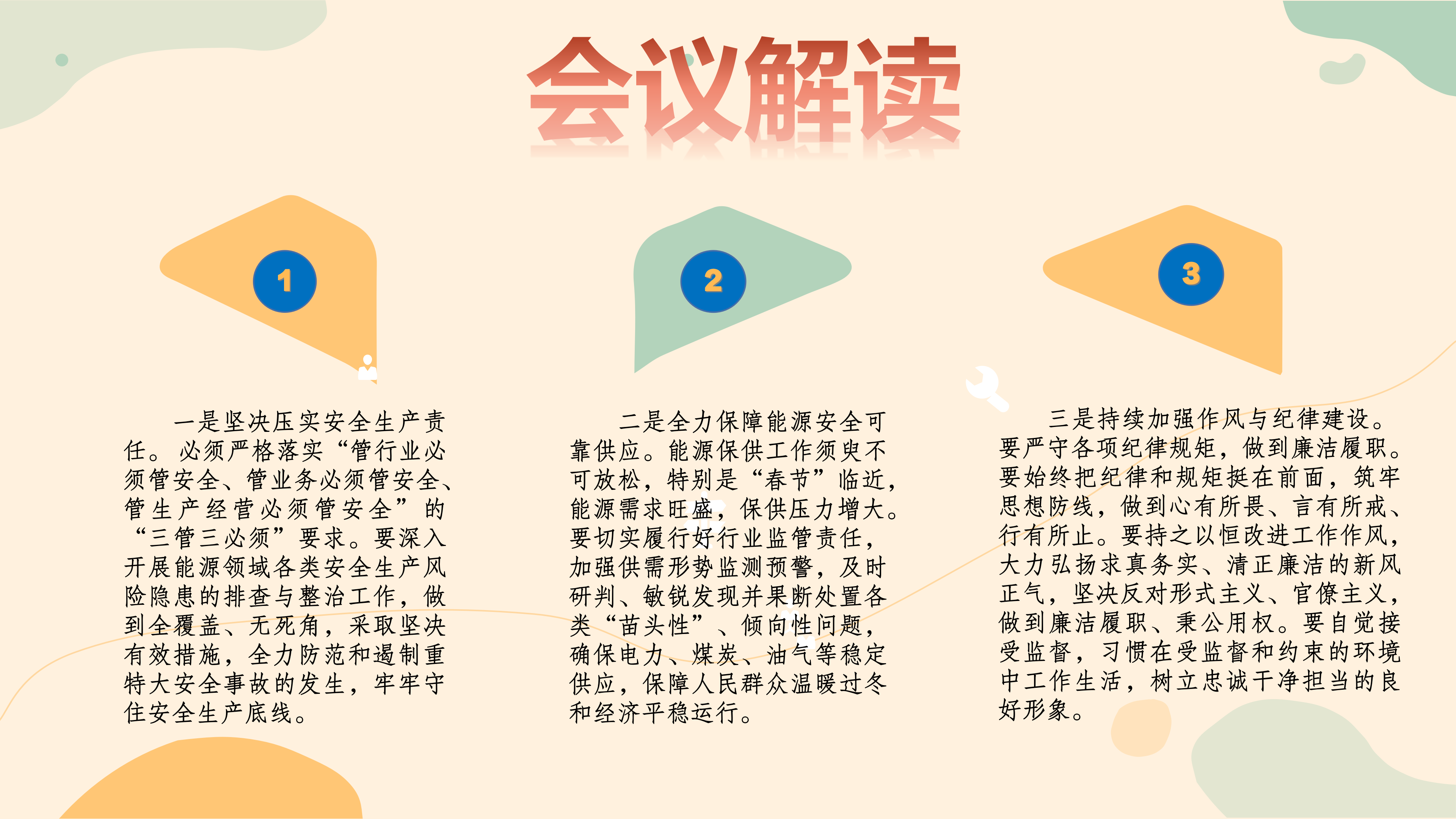 会议要求,一是坚决压实安全生产责任。 必须严格落实“管行业必须管安全、管业务必须管安全、管生产经营必须管安全”的“三管三必须”要求。要深入开展能源领域各类安全生产风险隐患的排查与整治工作,做到全覆盖、无死角,采取坚决有效措施,全力防范和遏制重特大安全事故的发生,牢牢守住安全生产底线。二是全力保障能源安全可靠供应。能源保供工作须臾不可放松,特别是“春节”临近,能源需求旺盛,保供压力增大。要切实履行好行业监管责任,加强供需形势监测预警,及时研判、敏锐发现并果断处置各类“苗头性”、倾向性问题,确保电力、煤炭、油气等稳定供应,保障人民群众温暖过冬和经济平稳运行。三是持续加强作风与纪律建设。 要严守各项纪律规矩,做到廉洁履职。要始终把纪律和规矩挺在前面,筑牢思想防线,做到心有所畏、言有所戒、行有所止。要持之以恒改进工作作风,大力弘扬求真务实、清正廉洁的新风正气,坚决反对形式主义、官僚主义,做到廉洁履职、秉公用权。要自觉接受监督,习惯在受监督和约束的环境中工作生活,树立忠诚干净担当的良好形象。