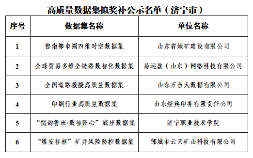 近日,山东省大数据局对2026年山东省“数据要素×”创新应用项目(高质量数据集建设)奖补对象名单进行公示。其中济宁市共有6个项目成功入围,获省级财政奖补支持,入围数量居全省第三。