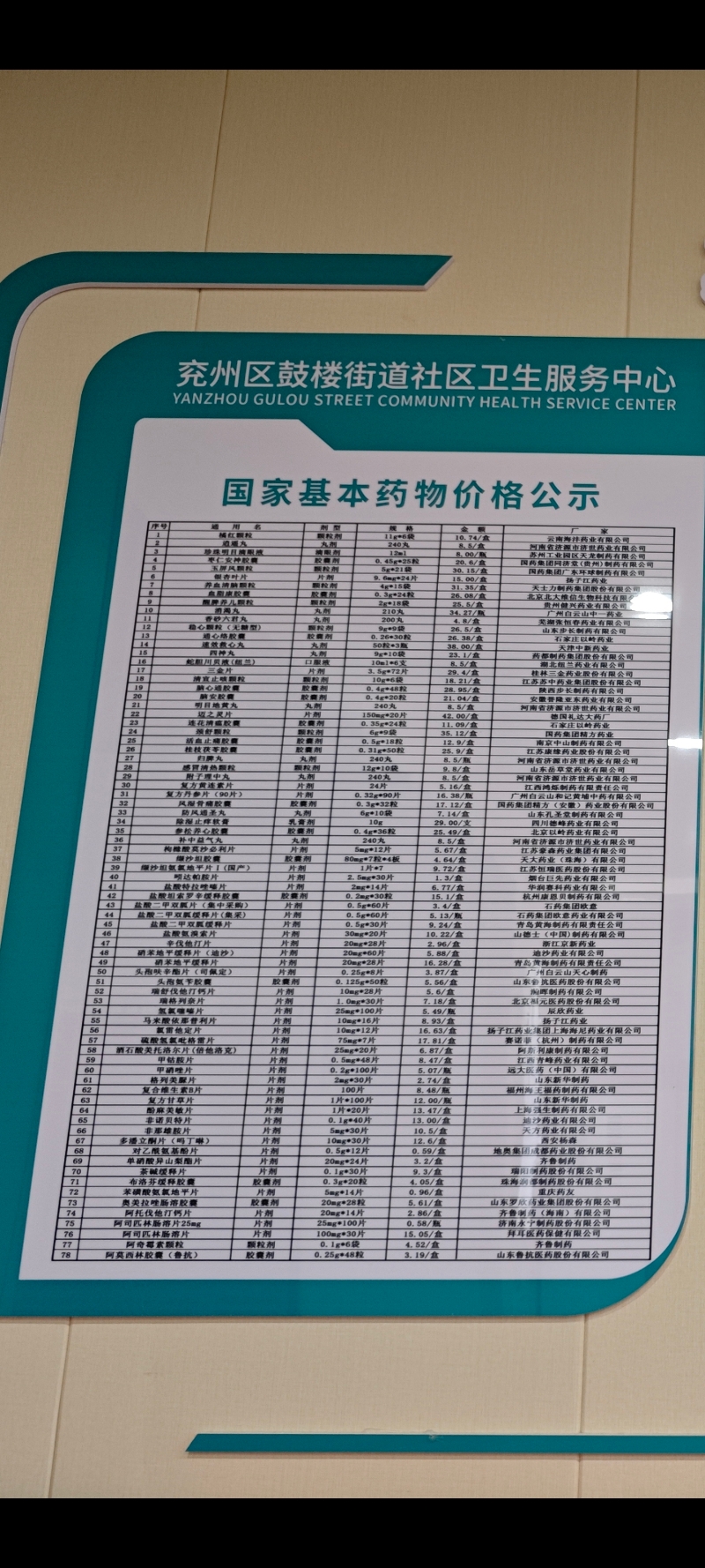 鼓楼街道社区卫生服务中心药品价格 | |||