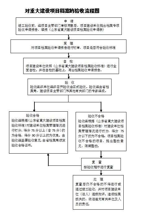 | 验收 | 验收组织单位组织召开验收会正式验收,验收组由市档案局、建设项目主管部门和其他有关部门的专家组成。 | 1个工作日 | 验收合格或不合格 |