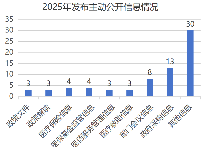 紧紧围绕全市医保中心工作和群众关心关注的医保热点,做好政策文件主动公开和解读,2025年发布主动公开信息71条,其中,政策文件3件,政策解读3篇,医疗保险信息4条,医保基金监管信息4条,医药服务管理信息3条,医疗救助信息3条,部门会议信息8条,政府采购信息13条,其他信息30条。